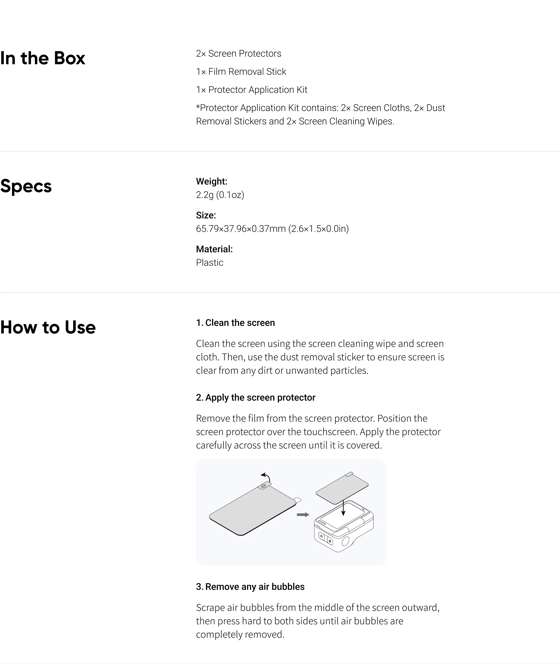 - Do not reinstall the same screen protector, as any dust that has collected on it may cause air bubbles and reduce adhesiveness.