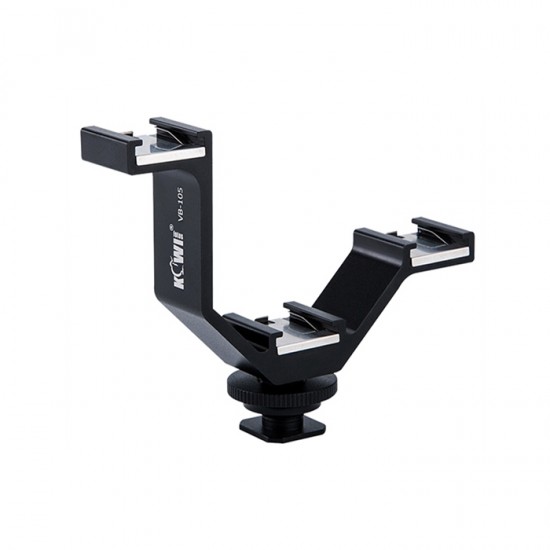 KIWIFOTOS VB Serisi Üçlü V-Braketi, ışıklar, monitörler, mikrofonlar ve diğer aksesuarlar için üç ilave aksesuar bağlantısı için bir kameranın cold shoe kızak yuvasına monte edilebilir. Üçlü V-Braketi, cold shoe kızak yuvasına veya 1/4 "-20 bağlantı vidasıyla herhangi bir yere bağlanabilir. V-Bracket yüksek kaliteli alüminyum alaşımlı malzemelerden üretilmiştir. Ayrıca üzerinde mevcut bulunan kilitleme diski braketi sabitler ve braketin kullanım sırasında dönmesini önler. Üç farklı boyut mevcuttur: 4.13 ", 4.92" ve 6.50 "genişliğinde