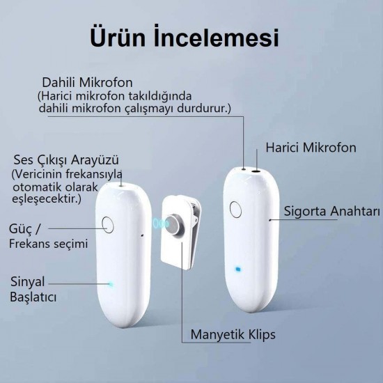Uluslrarası UHF Kablosuz İletim Sistemine sahip 1 Alıcı ve 1 Vericiden oluşur.