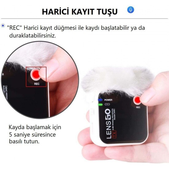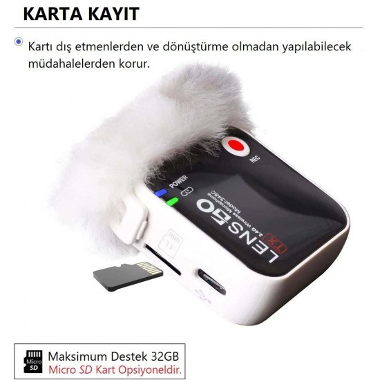 Dahili Micro SD kart yuvasına sahip olan yaka mikrofonu, maksimum 32 GB kapasite ile, kaydedilen sesin kaybolmasını önlemek için eş zamanlı olarak kaydeder. Harici REC kayıt düğmesi, bazı istenmeyen sesleri önlemek üzere kayıt işlemini durdurabilir/başlatabilir.