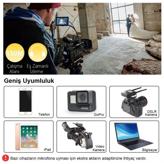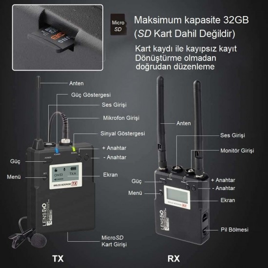 "Kayıt Menüsü" - "Etkinleştir" i seçerek çekim sırasında eş zamanlı kayıt yapabilirsiniz. Ses kaybını önlemek ve kesme noktaları ile harici kanal girişimi nedeniyle oluşabilecek ses kaydı kaybını önlemek için 32G (Max) MicroSD kablosuz mikrofon vericisine takabilirsiniz. Not: MicroSD kartı dahil değildir.