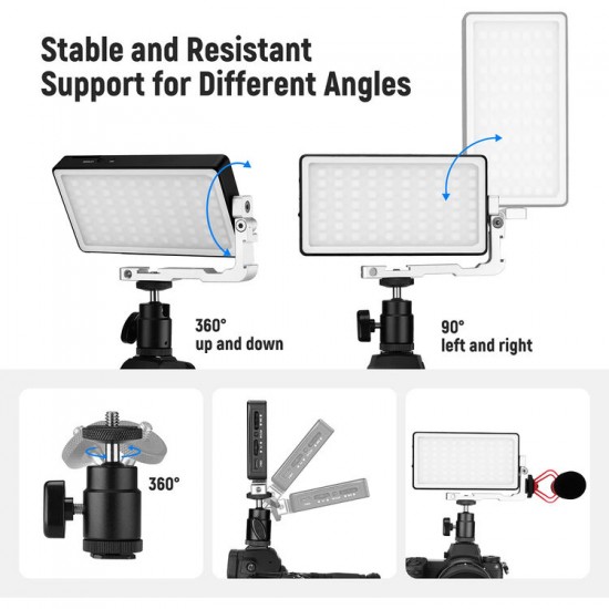 - Pan ve Tilt Ayarlanabilir ve Alüminyum Alaşımlı Gövde - SL90 LED panel ışığı, soğuk yuva montaj noktasına sahip, dönebilen (360° eğim ve 90° yatay hareket) bir döner kola sahiptir. Farklı açılarda yukarı ve aşağı doğru yüksek direnç ve stabiliteyle çevrilebilir. Alüminyum alaşımlı yapısı dayanıklılığını garanti eder.