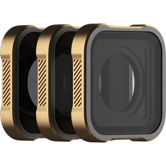 Hero13 Black, Hero12 Black, Hero11 ve Hero10 ile uyumlu 3'lü nötr yoğunluk filtresi seti, aksiyon tutkunlarının enstantane hızlarını sinematik seviyelere düşürmesine olanak tanır.