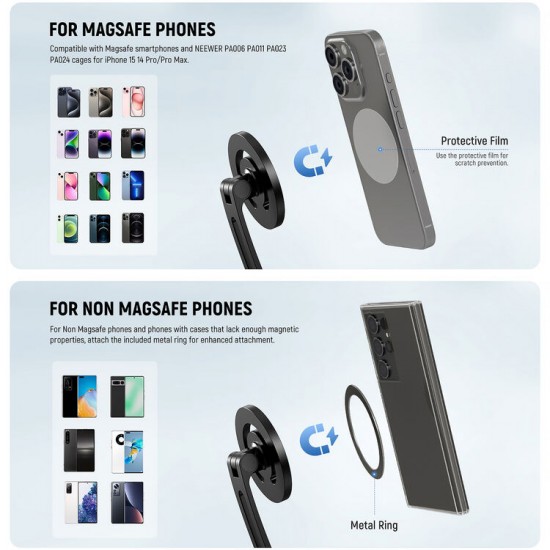 Çeşitli Açılar Arasında Geçiş: Üç katlı manyetik telefon tutucu, yukarıdan, dikey ve yatay çekimler gibi çeşitli açılara olanak tanımak için **180°'ye kadar** ayarlanabilir. Portre, manzara, vlog ve diğer fotoğrafçılık/video çekimleri için idealdir.
